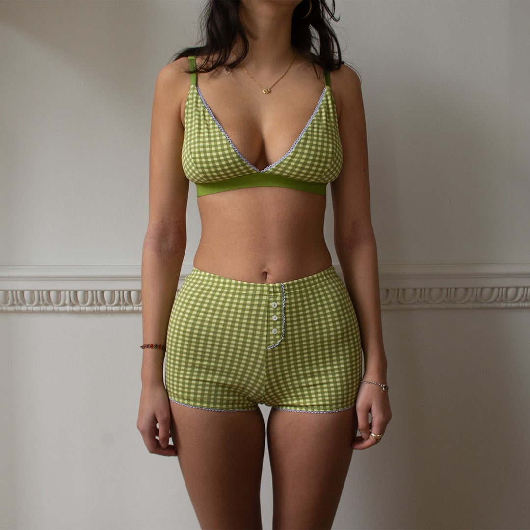 Our bra is a classic; super comfy, flattering and pretty. Our matching bloomers are also super comfy—they're made of the same organic cotton knit fabric—and are designed so that they don't ride up. Matching your undies to your bra is always a good way to feel put together!